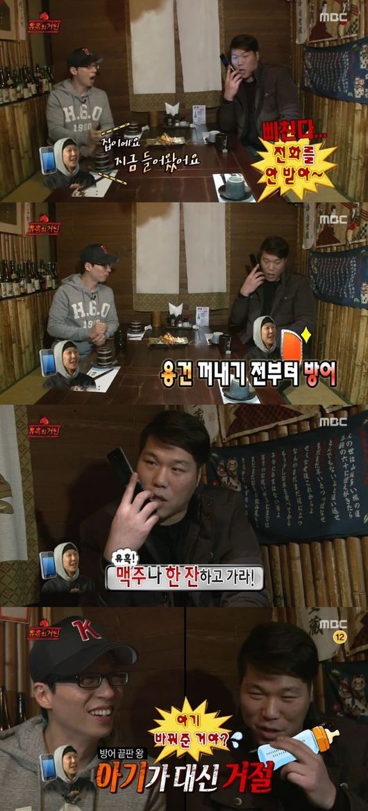 '무한도전' 녹화가 오후라는 사실을 알고 있던 서장훈은 하하의 방어에 황당해했고, 하하는 아기를 바꿔주며 단호하게 거절, 웃음을 자아냈다.