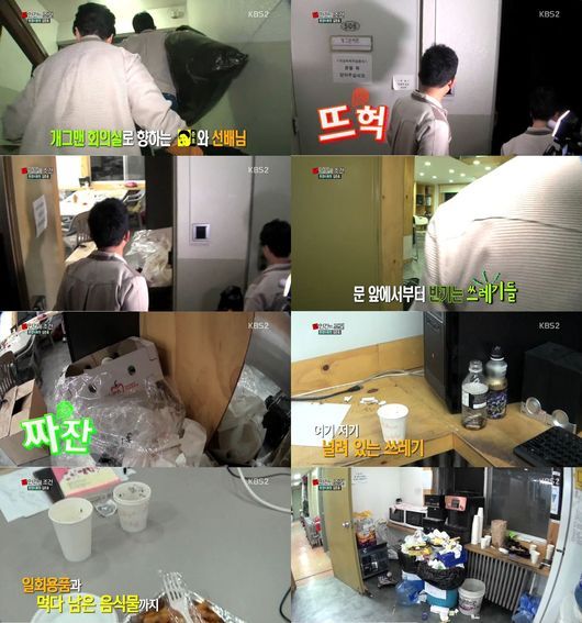 이날 방송에서는 김준호는 환경미화원과 함께 '개그콘서트' 연습실 청소에 나섰다. 쓰레기장을 방불케하는 상황이 눈길을 끌었다. 그는 "깨끗하게 쓰자"며 후배들에게 영상편지를 보내기도 했다.