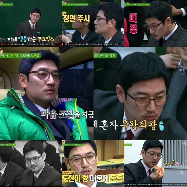 40대 남자들의 우정이 이토록 귀엽다니. 윤도현은 엄마처럼 바비킴 옆에 꼭 붙어 손을 잡을 등교했고 긴장하는 바비킴에게 계속 말을 걸었다. 바비킴은 그런 윤도현에게 투정 부리듯 굴기도 했다. 교무실에 간 바비킴은 담임 선생님들 기다리던 중 강남이 등장하자 연장자인 자신이 자리에서 일어나 양보하려고 하고 밥까지 사주겠다고 나섰다. 이어 담임선생님을 만나서는 “걱정이 (윤도현) 형이 없으면 뭘 해야 하는지 모르겠다”며 “짝이 계속 끝까지 같은 반이냐”고 불안해했다.