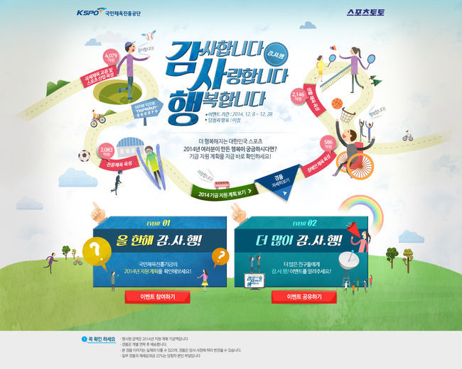 두 가지 방식으로 진행되는 이번 이벤트에서 첫 번째 ‘올 한해 감.사.행!’ 이벤트의 경우, 생활체육육성, 전문 체육 육성, 장애인 체육 육성, 국제체육 교류 및 스포츠 산업 육성 등 다양한 방면으로 지원이 계획된 국민체육진흥기금의 쓰임새를 살펴보기만 하면 추첨을 통해 순토 아웃도어 시계 1명, 오클리 선글라스 5명, 몰스킨 2015 플래너 50명, 커피빈 바닐라라떼 S 기프티콘 200명 등 푸짐한 상품을 증정한다. 하루에 한번만 참여할 수 있으며, 많이 참여할수록 당첨 가능성이 높아진다.