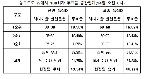 2014-2015시즌 농구토토 W매치 108회차 투표율 중간집계 결과…신한은행 우세 전망