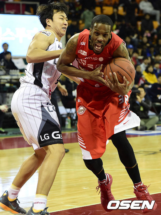 14일 오후 서울 잠실학생체육관에서 열린 '2014-2015 KCC 프로농구' 서울 SK와 창원 LG의 경기, 1쿼터 SK 헤인즈가 LG 김영환의 수비를 돌파하고 있다.
