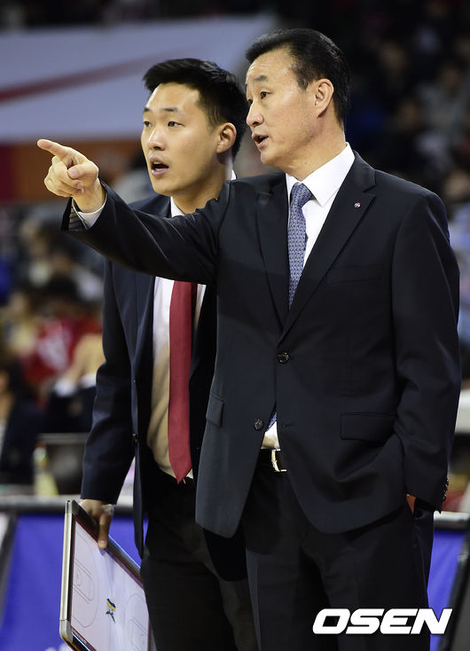 14일 오후 서울 잠실학생체육관에서 열린 '2014-2015 KCC 프로농구' 서울 SK와 창원 LG의 경기, 1쿼터 LG 김진 감독이 작전지시를 하고 있다.