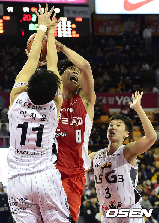 14일 오후 서울 잠실학생체육관에서 열린 '2014-2015 KCC 프로농구' 서울 SK와 창원 LG의 경기, 2쿼터 SK 박상오의 슛을 LG 이지운이 막아서고 있다.