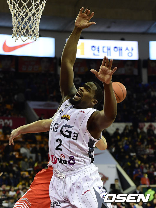 14일 오후 서울 잠실학생체육관에서 열린 '2014-2015 KCC 프로농구' 서울 SK와 창원 LG의 경기, 3쿼터 LG 메시가 리바운드를 시도하고 있다.