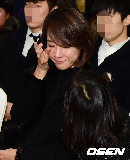故 신해철 배우자 윤원희가 눈물을 닦고 있다.