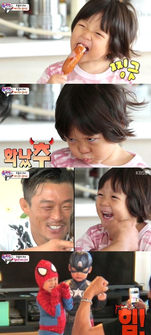 14일 방송된 KBS 2TV 예능프로그램 '해피선데이-슈퍼맨이 돌아왔다'에서는 사랑이 아빠 추성훈 앞에서 핫도그를 먹으며 애교를 부리는 모습이 전파를 탔다.