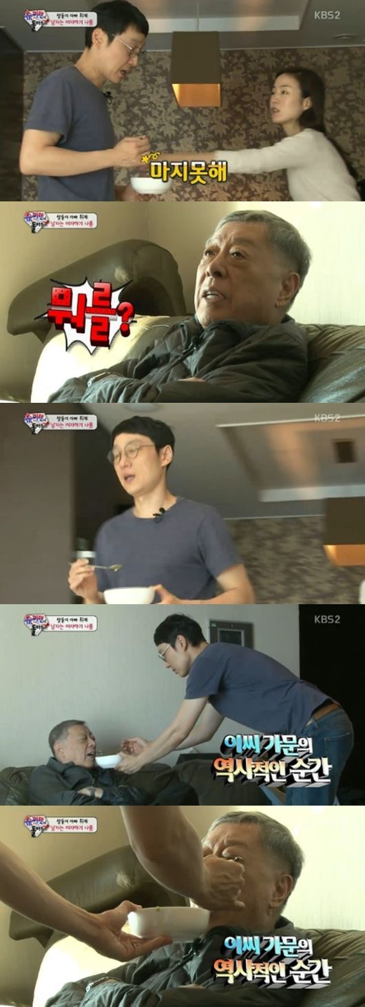 이휘재는 쑥스러워 하면서도 아버지께 죽을 한 숟가락 가져다드리며 어색하지만 훈훈한 광경을 만들어냈다.