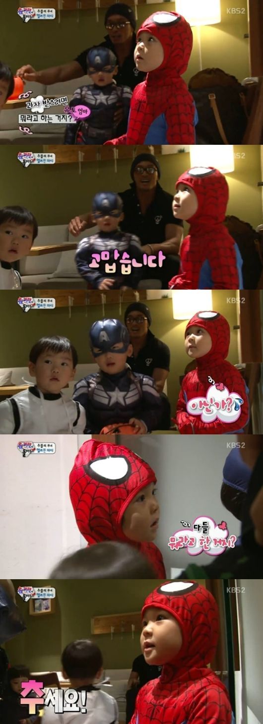 사랑과 유토는 스파이더맨과 캡틴아메리카로 변신해 사탕을 받았다. 특히 사랑은 “추세요”라면서 사탕을 받고 “고맙습니다”라고 말해 웃음을 안겼다.
