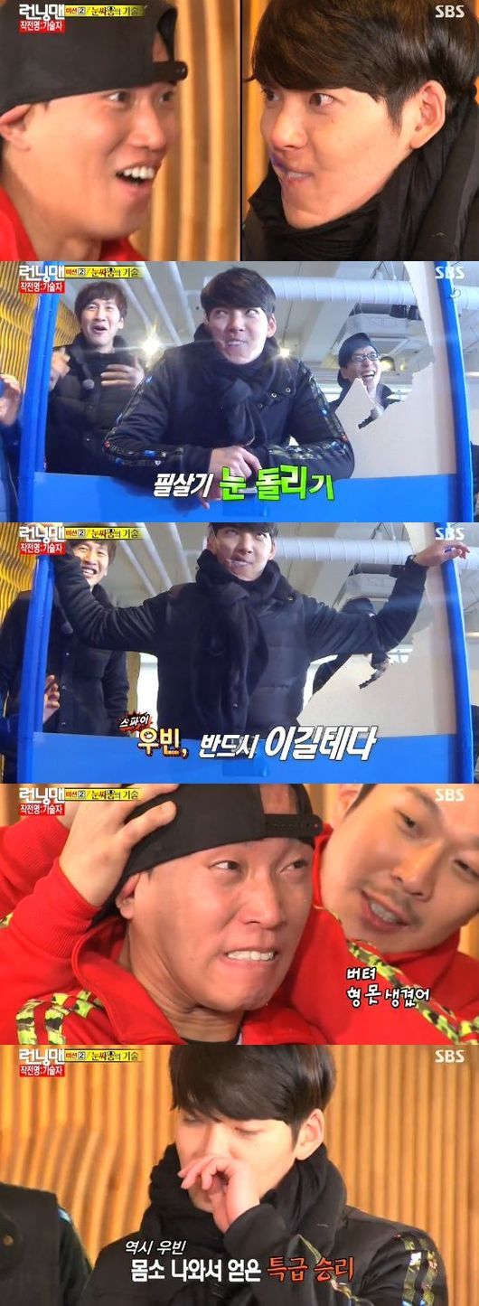 김우빈은 14일 오후 방송된 SBS 예능프로그램 '일요일이 좋다-런닝맨'(이하 '런닝맨')에서 눈싸움 선수로 나서서 개리와 대결을 펼쳤다. 이에 개리도 이긴 코믹한 분장을 보여준 것.