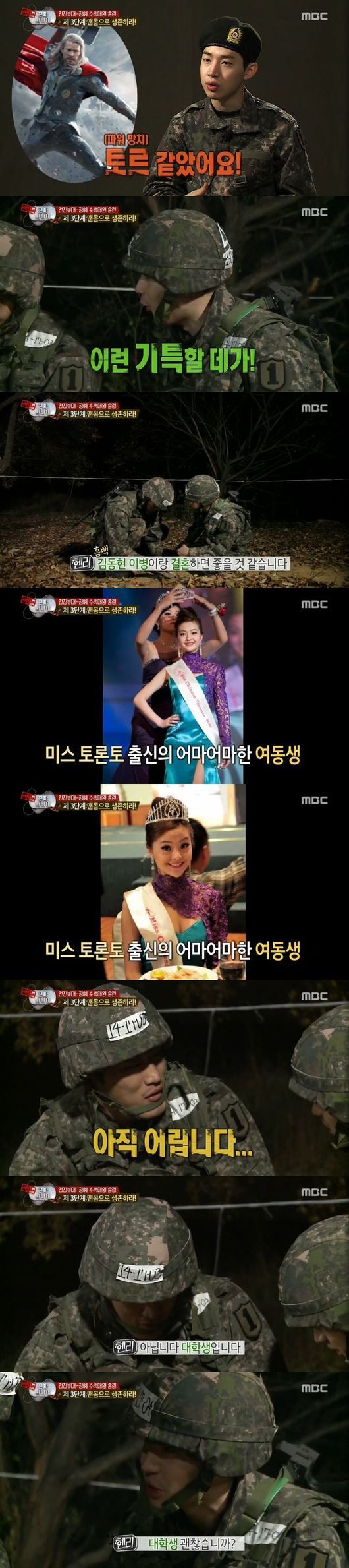 김동현은 14일 오후 방송된 MBC 예능프로그램 '일밤-진짜사나이'(이하 '진짜사나이')에서 미스 토론토 출신 헨리의 여동생에게 관심을 드러냈다.