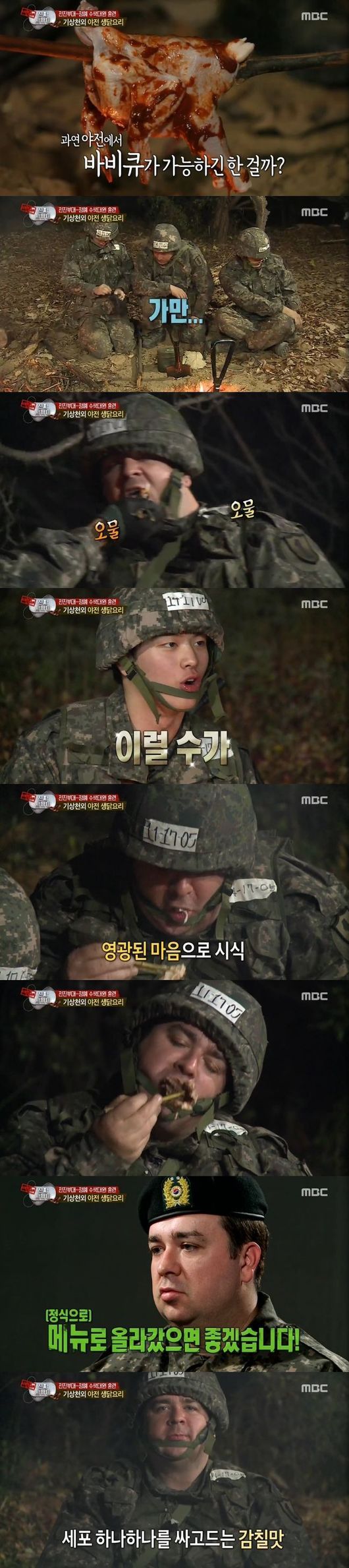 야전 취식 '먹방'이 군대 생활의 '리얼'함을 보여줬다. 특히 생닭과 고추장, 쌀만으로 만들어진 요리는 보는 이들의 군침을 돌게 할 정도라 눈길을 끌었다.