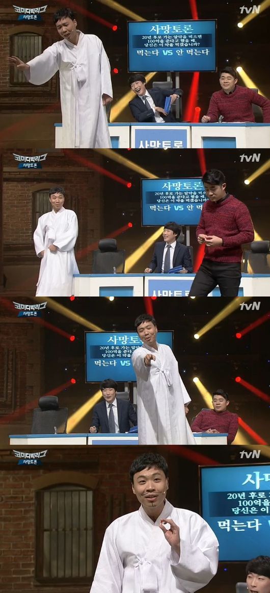 14일 오후 방송된 '코미디 빅리그' 4쿼터 '사망토론' 코너에서는 김기욱 vs 이상준이 '20년 후로 가는 알약을 먹으면 100억을 준다고 했을 때 당신은 이 약을 먹겠느냐?'는 주제를 놓고 토론을 벌였다.