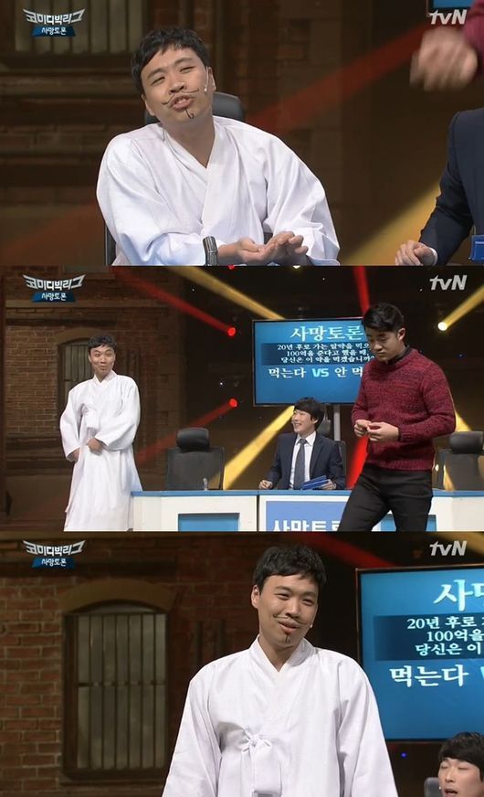14일 오후 방송된 '코미디 빅리그' 4쿼터 '사망토론' 코너에서는 김기욱 vs 이상준이 '20년 후로 가는 알약을 먹으면 100억을 준다고 했을 때 당신은 이 약을 먹겠느냐?'는 주제를 놓고 격한 토론을 벌였다.