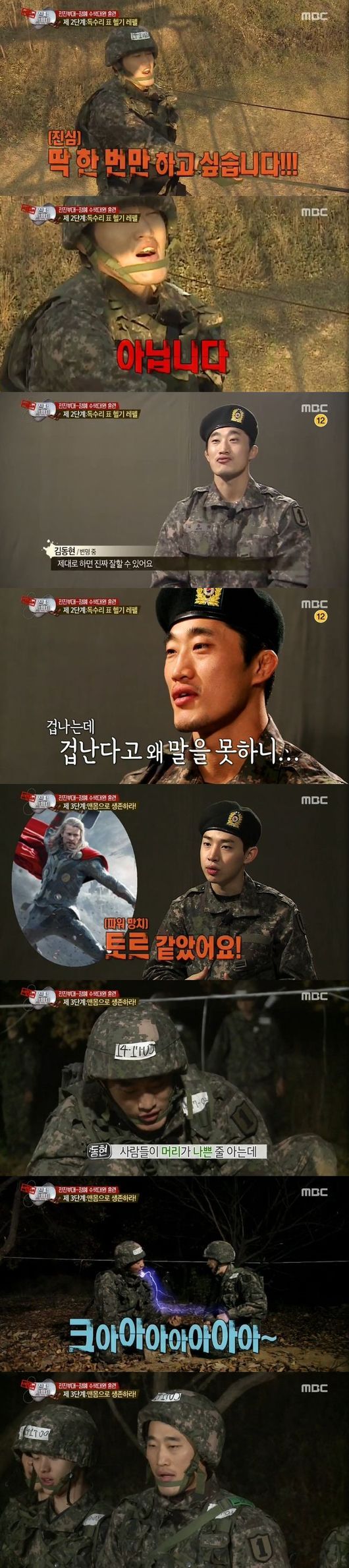 결국 김동현은 땅으로 내려와 굴욕의 체력 단련을 받았다. 이후 이어진 인터뷰에서 "제대로 하면 잘 할 수 있다"고 겁을 먹지 않은 듯 변명을 하던 그는 교관에 의해 또 다시 헬기레펠에 강제 재도전 하게 됐고 두려움에 맞서야(?)했다. 스스로 겁 없는 해병대 출신임을 자랑스러워했던 평소의 모습과 달라 웃음을 주는 대목이었다.