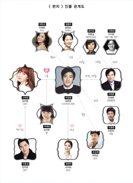 '펀치'는 주인공 박정환(김래원 분)과 신하경(김아중 분), 이태준(조재현 분)을 중심으로 촘촘하게 엮인 인물들의 욕망과 갈등, 사랑과 우정, 믿음과 배신 등의 이야기를 담아낼 작품으로, 공개된 관계도 속 캐릭터들은 '펀치'의 주 무대가 될 3개의 공간인 대검찰청, 세탁소, 아파트로 각각 그룹을 나누어볼 수 있다.