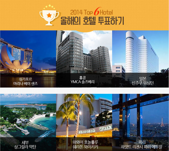 그 결과 ▲일본에서는 도쿄의 신주쿠워싱턴, ▲홍콩은 YMCA솔즈베리, ▲싱가포르는 마리나베이 샌즈, ▲세부는 샹그릴라 막탄, ▲하와이는 호놀룰루 쉐라톤 와이키키, ▲파리에서는 하얏트 리젠시 파리 에투알이 Top6 호텔로 뽑혔다.