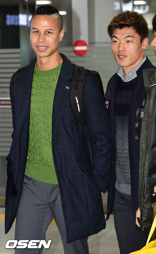 슈틸리케호가 15일 오전 제주공항을 통해 결전지에 입성했다. 강수일과 이종호가 입국장에서 환하게 미소짓고 있다.