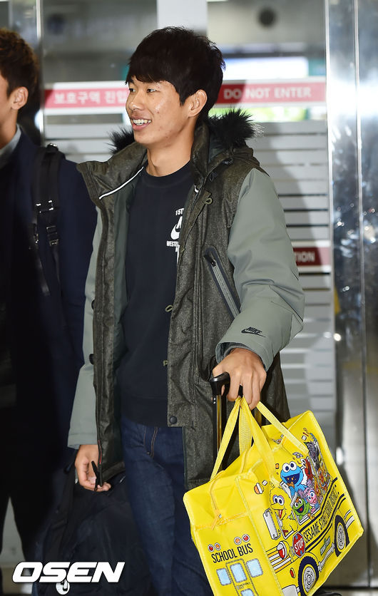 슈틸리케호가 15일 오전 제주공항을 통해 결전지에 입성했다. 윤일록이 입국장에서 환하게 미소짓고 있다.
