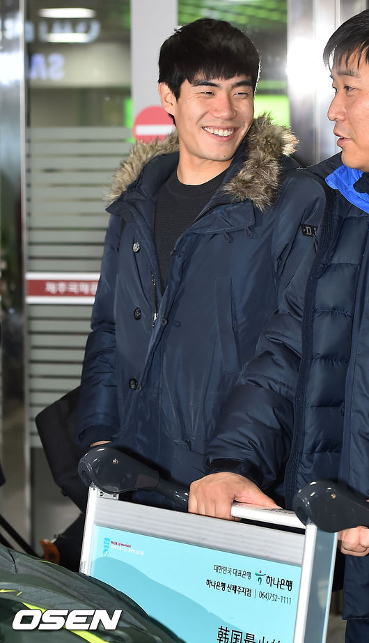 슈틸리케호가 15일 오전 제주공항을 통해 결전지에 입성했다. 김주영이 입국장에서 미소짓고 있다.