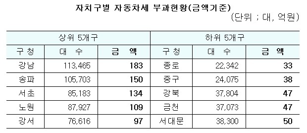 이번 제2기분 자동차세의 부과 금액은 강남구, 송파구, 서초구, 노원구 순으로 많았고 종로구, 중구, 강북구, 금천구 순으로 적었으며 강남구의 경우는 11만 3000대 183억 원이 부과된 반면 종로구의 경우는 2만 2000대 33억 원이 부과됐다.