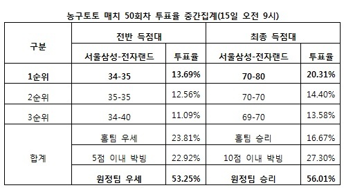 국민체육진흥공단(www.kspo.or.kr)이 발행하는 체육진흥투표권 수탁사업자 스포츠토토의 공식 온라인 발매사이트인 베트맨(www.betman.co.kr)이 오는 16일 오후 7시에 잠실실내체육관에서 열리는 서울삼성-전자랜드전을 대상으로 한 농구토토 매치 50회차 투표율을 중간 집계한 결과 56.01%가 원정팀 전자랜드의 승리를 예상했다고 전했다.