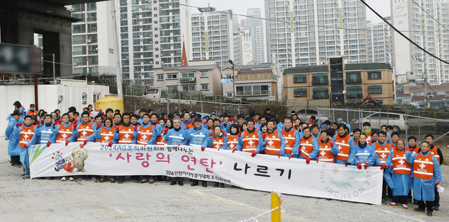 2014인천아시아경기대회 조직위원회(위원장 김영수)의 연탄 나르기 봉사활동이 15일 인천시 남구 학익동 일대에서 진행됐다. 저소득층 가정의 따뜻한 겨울나기 돕기를 위해 마련된 이날 봉사활동에는 김영수 위원장을 비롯해 임직원 200여명이 참여해 33가구에 총 1만 장의 연탄을 훈훈한 이웃 사랑의 정을 담아 전달했다.