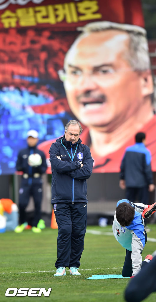 슈틸리케호가 15일 오전 제주공항을 통해 결전지에 입성했다. 서귀포시민구장서 슈틸리케 감독이 첫 훈련을 지켜보고 있다.