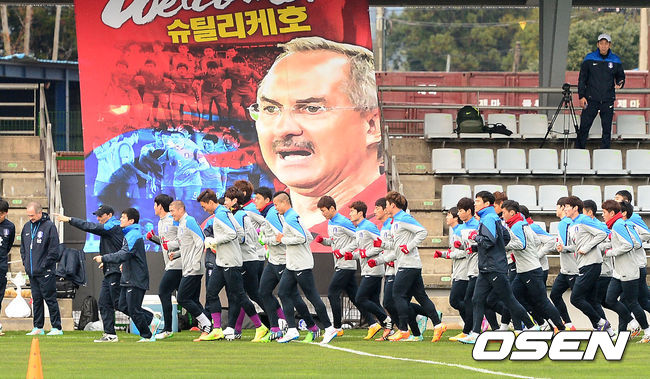 슈틸리케호가 15일 오전 제주공항을 통해 결전지에 입성했다. 서귀포시민구장서 선수들이 러닝훈련을 하고 있다.