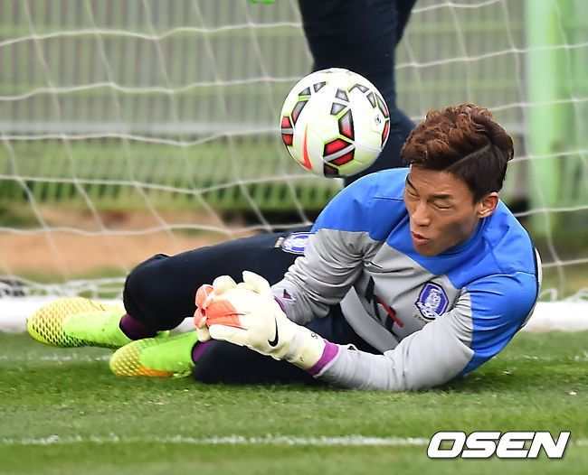 슈틸리케호가 15일 오전 제주공항을 통해 결전지에 입성했다. 서귀포시민구장서 김승규가 수비훈련을 할때 볼이 튀어올라 깜짝 놀라고 있다.