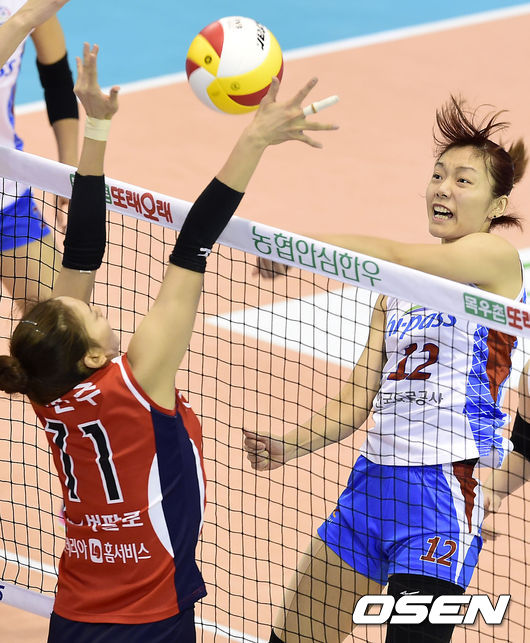 15일 오후 대전 충무실내체육관에서 열린 '2014-2015 NH농협 V-리그 여자부' KGC인삼공사와 한국도로공사의 경기, 1세트 도로공사 문정원이 스파이크를 시도하고 있다.