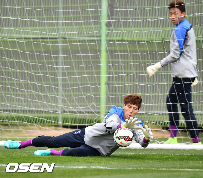 슈틸리케호가 15일 오전 제주공항을 통해 결전지에 입성했다. 서귀포시민구장서 오후 훈련때 김진현이 수비훈련을 하고 있다.