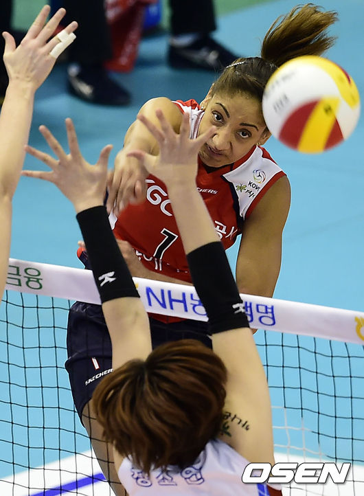 15일 오후 대전 충무실내체육관에서 열린 '2014-2015 NH농협 V-리그 여자부' KGC인삼공사와 한국도로공사의 경기, 1세트 인삼공사 조이스가 스파이크를 시도하고 있다.