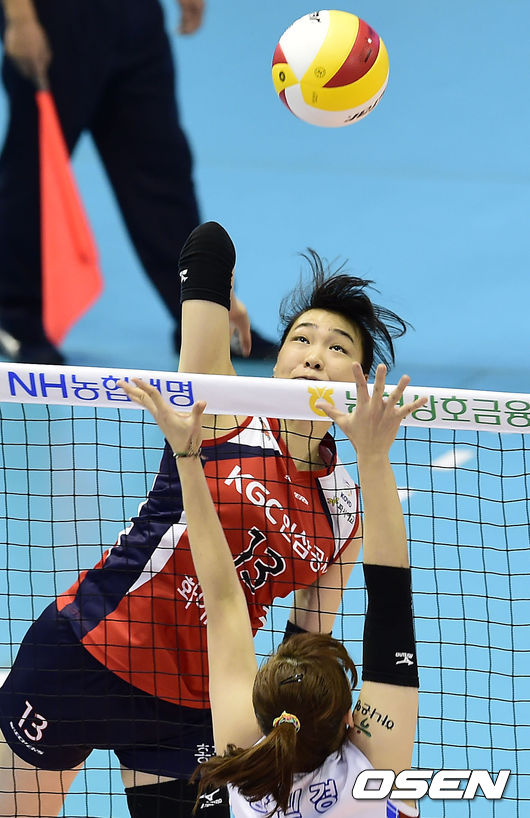 15일 오후 대전 충무실내체육관에서 열린 '2014-2015 NH농협 V-리그 여자부' KGC인삼공사와 한국도로공사의 경기, 1세트 인삼공사 유미라가 스파이크를 시도하고 있다.