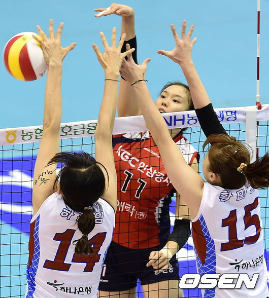 15일 오후 대전 충무실내체육관에서 열린 '2014-2015 NH농협 V-리그 여자부' KGC인삼공사와 한국도로공사의 경기, 2세트 인삼공사 이연주가 스파이크를 시도하고 있다.