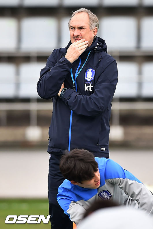 슈틸리케호가 15일 오전 제주공항을 통해 결전지에 입성했다. 서귀포시민구장서 오후 훈련때 슈틸리케 감독이 훈련을 지켜보며 생각에 잠겨있다.