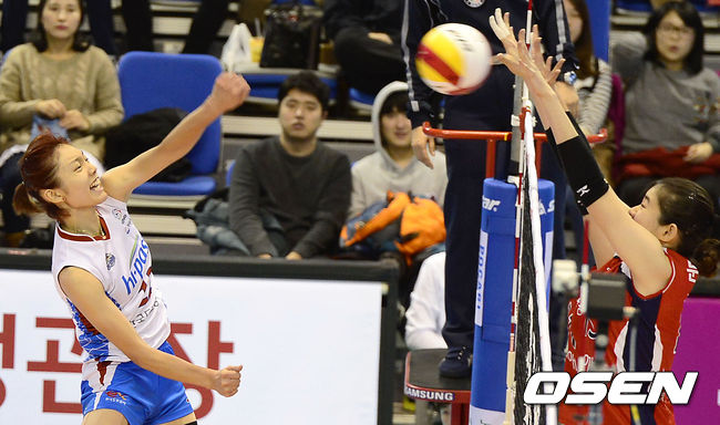 15일 오후 대전 충무실내체육관에서 열린 '2014-2015 NH농협 V-리그 여자부' KGC인삼공사와 한국도로공사의 경기, 4세트 도로공사 문정원이 스파이크를 시도하고 있다.