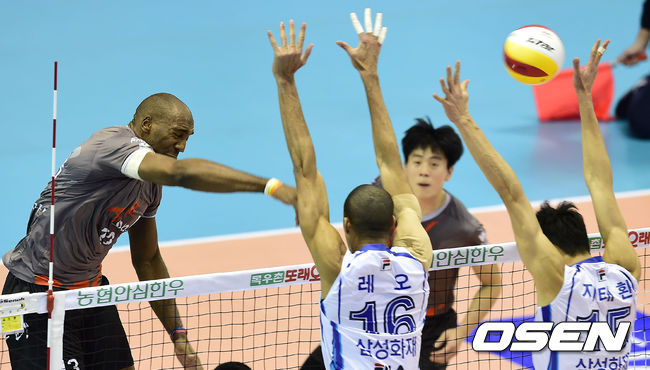 15일 오후 대전 충무실내체육관에서 열린 '2014-2015 NH농협 V-리그' 삼성화재와 OK저축은행의 경기, 1세트 OK저축은행 시몬이 스파이크를 시도하고 있다.
