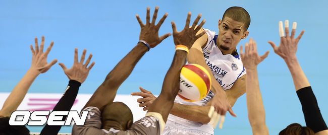 15일 오후 대전 충무실내체육관에서 열린 '2014-2015 NH농협 V-리그' 삼성화재와 OK저축은행의 경기, 2세트 삼성화재 레오가 스파이크를 시도하고 있다.