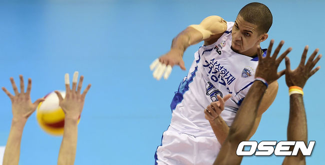 15일 오후 대전 충무실내체육관에서 열린 '2014-2015 NH농협 V-리그' 삼성화재와 OK저축은행의 경기, 2세트 삼성화재 레오가 스파이크를 시도하고 있다.