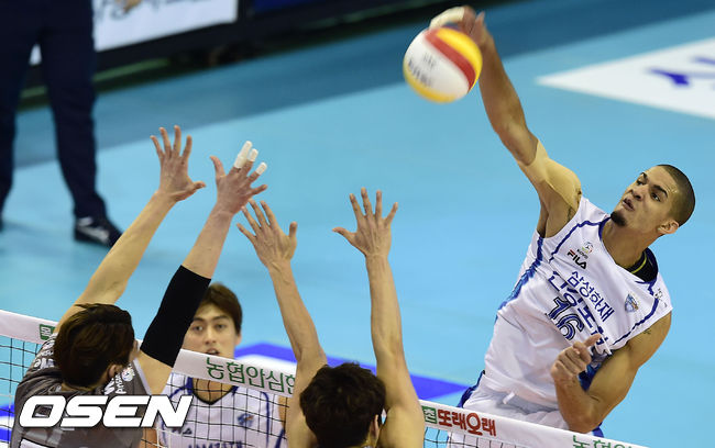 15일 오후 대전 충무실내체육관에서 열린 '2014-2015 NH농협 V-리그' 삼성화재와 OK저축은행의 경기, 2세트 삼성화재 레오가 스파이크를 시도하고 있다.