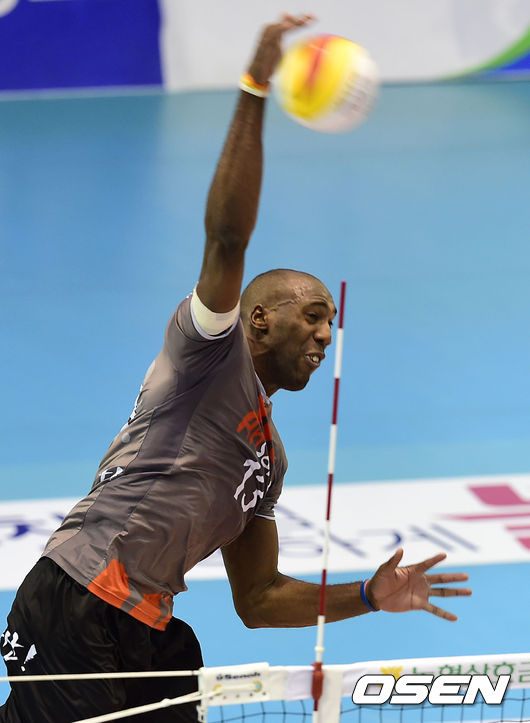 15일 오후 대전 충무실내체육관에서 열린 '2014-2015 NH농협 V-리그' 삼성화재와 OK저축은행의 경기, 4세트 OK저축은행 시몬이 스파이크를 시도하고 있다.