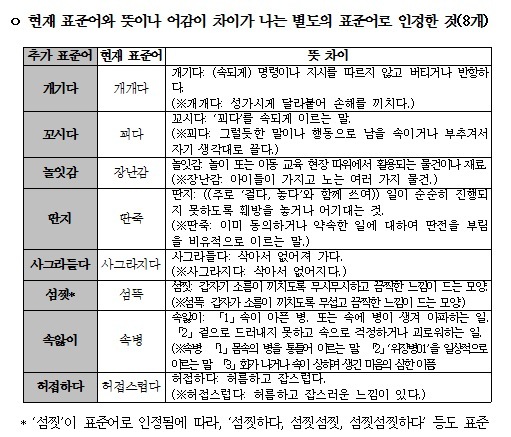 둘째, 현재 표준어와는 뜻이나 어감이 달라 이를 별도의 표준어로 인정한 경우이다. 그동안 ’놀잇감‘은 ’장난감‘으로 써야 했으나 ’놀잇감‘과 ’장난감‘은 쓰임이 다르기 때문에 ’놀잇감‘을 별도의 표준어로 인정하였다. 이렇게 별도의 표준어로 인정된 말은 ’놀잇감‘, ’개기다‘, ’사그라들다‘, ’속앓이‘, ’허접하다‘, ’딴지‘, ’섬찟‘, ’꼬시다‘ 등 모두 8항목이다.