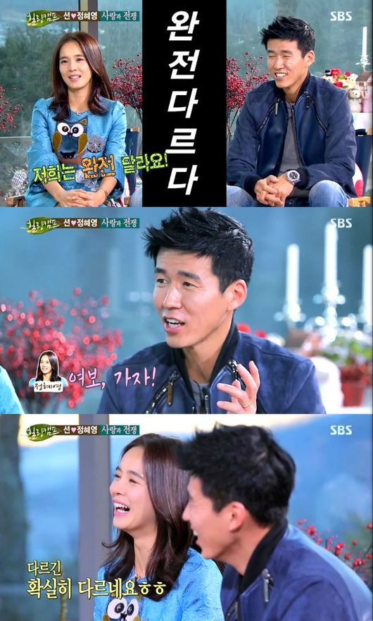 정혜영은 15일 오후 방송된 SBS 예능프로그램 '힐링캠프, 기쁘지 아니한가'(이하 '힐링캠프')에서 "(남편과) 식성 ,온도, 속도도 다르다. 나는 성급하고 남편은 느긋하게 웃는 스타일이다"라고 말했다.