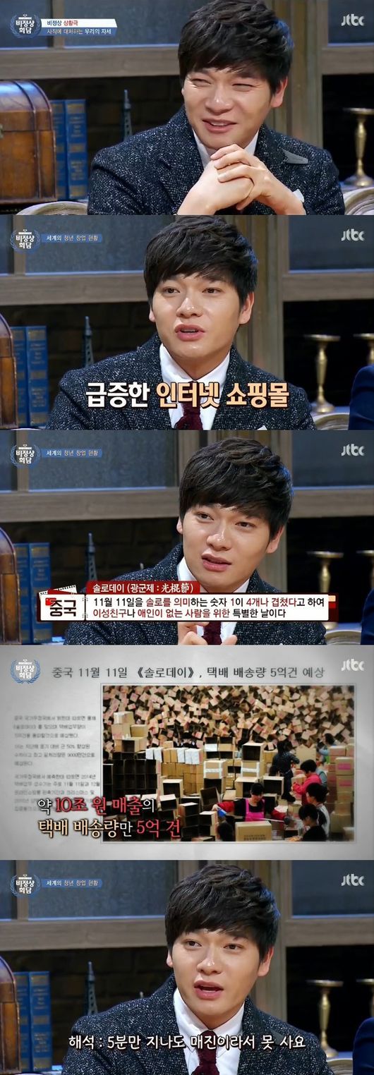 장위안은 “올해 솔로데이 매출만 600억 위안이었다. 한국 돈으로 10조 매출을 올렸다고 한다”면서 “솔로데이 당일에 사려고 하면 이미 매진돼 못산다. 11월 11일 자정에 눌러야 살 수 있다. 5분만 지나도 매진된다”고 덧붙여 모두를 놀라게 했다.