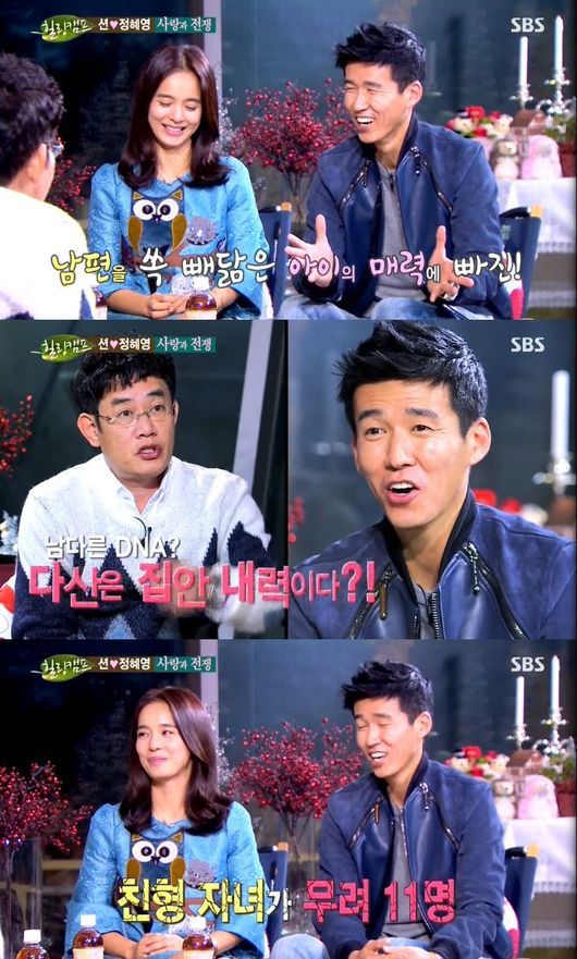 이에 MC는 "집안 내력이 다산이라고 하더라"라고 물었고 션은 "친형 자녀가 11명이다. 형이랑 두 형제밖에 없는데 나에게 11명의 조카가 있다"고 말해 놀라움을 줬다.