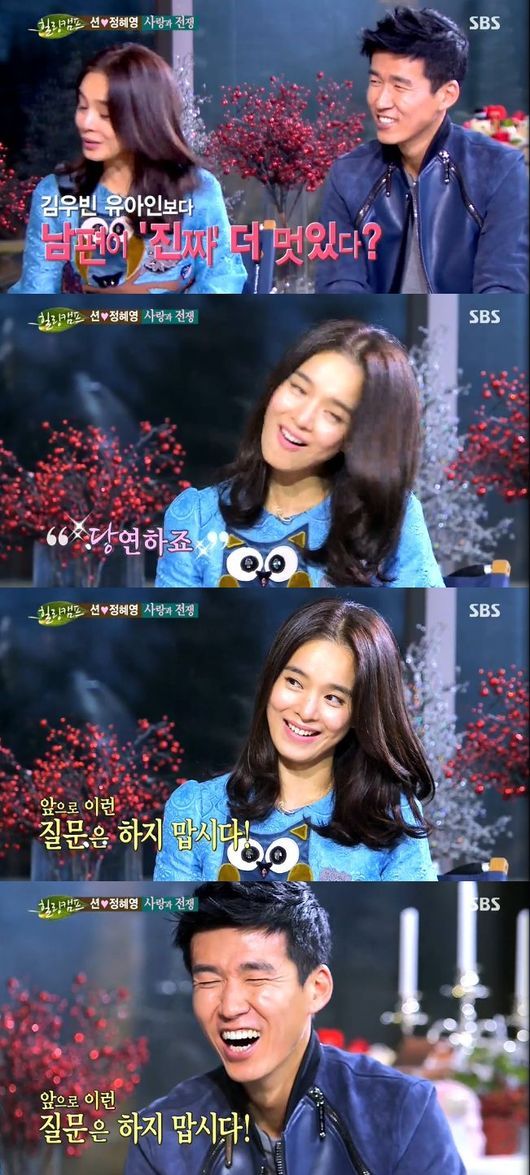 정혜영은 15일 오후 방송된 SBS 예능프로그램 '힐링캠프, 기쁘지 아니한가'(이하 '힐링캠프')에서 요즘 유행하는 연하 로맨스 드라마를 찍고 싶지 않느냐는 질문과 함께 "남편이 김우빈-유아인보다 멋있느냐"는 MC들의 질문에 "당연하죠"라고 말해 웃음을 줬다.