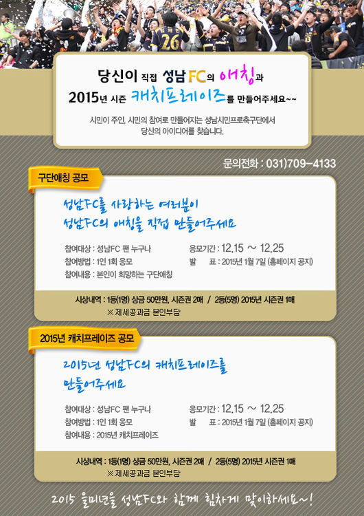 성남FC가 내년 시즌을 앞두고 구단의 이미지를 잘 나타내는 ‘성남FC 애칭’과 2015년 ‘캐치프레이즈’를 공모한다.