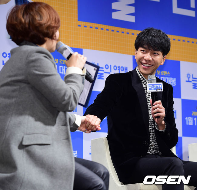 16일 오전 서울 신사동 CGV 압구정에서 열린 영화 '오늘의 연애' 제작보고회에서 이승기가 사회자 박경림의 손을 잡고 있다.