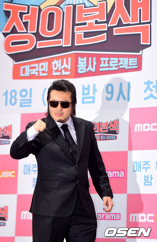 배우 김보성이 16일 오후 서울 여의도 IFC몰 내 CGV에서 열린 MBC 플러스미디어 예능 프로그램 '정의본색' 제작발표회에 참석해 포토타임을 갖고 있다.
